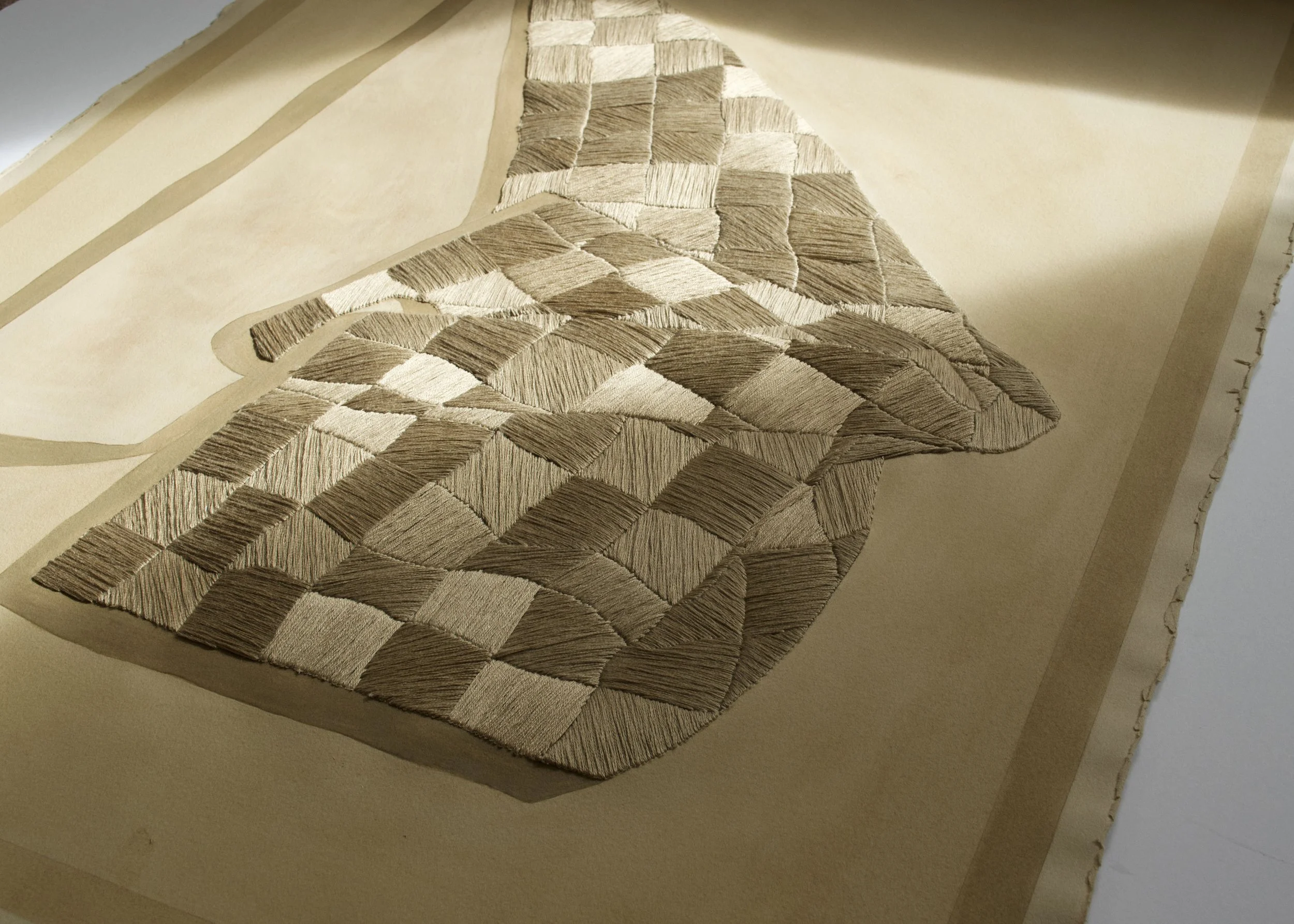 Medium: cotton thread, watercolor, gouache, colored pencil, handmade paper